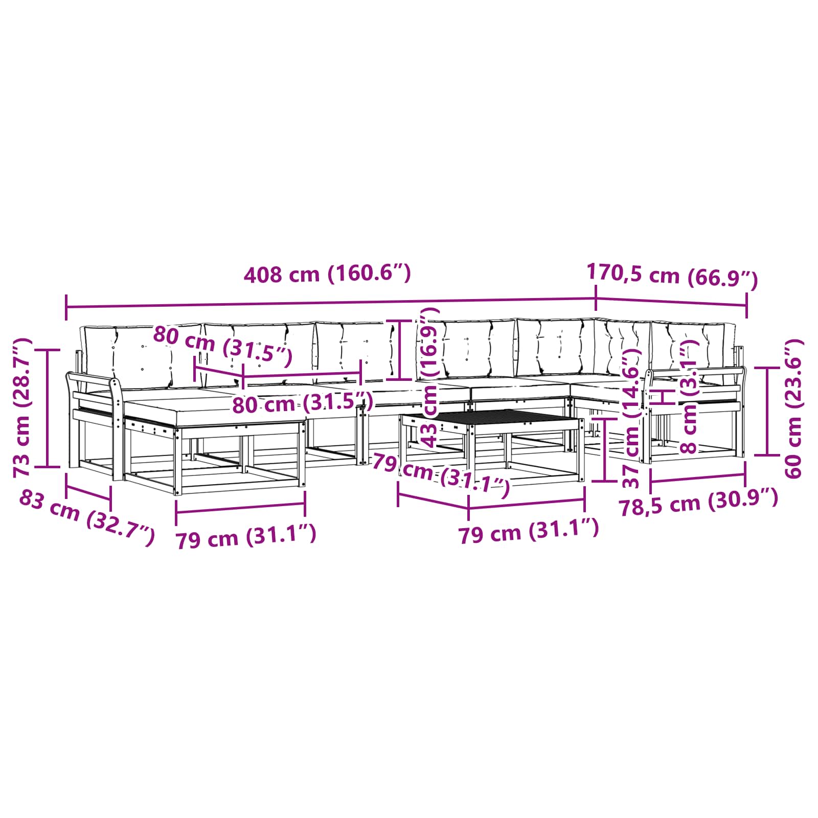 - 7 x Cuscino Seduta: 80 x 80 x 8 cm (LxPxA)