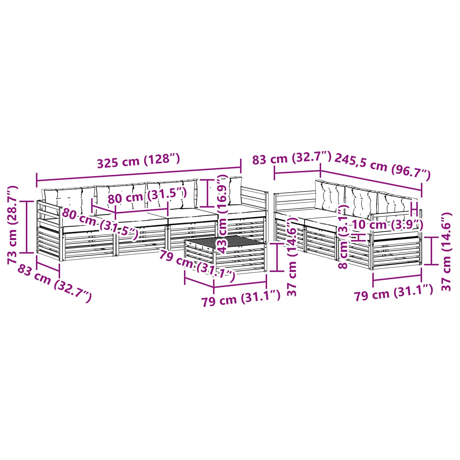 - 7 x Cuscino Posteriore: 80 x 43 x 10 cm (LxWxH)