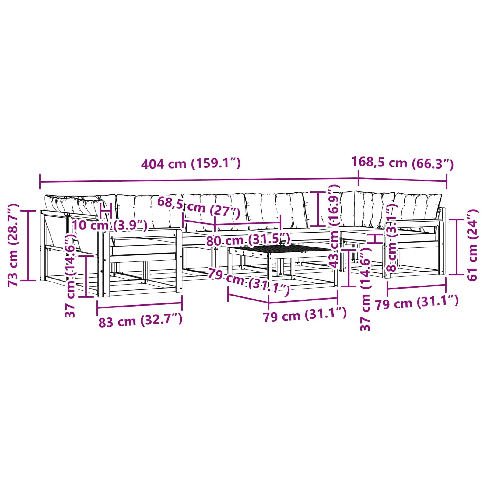 - 9 x Cuscino Posteriore: 80 x 43 x 10 cm (LxWxH)