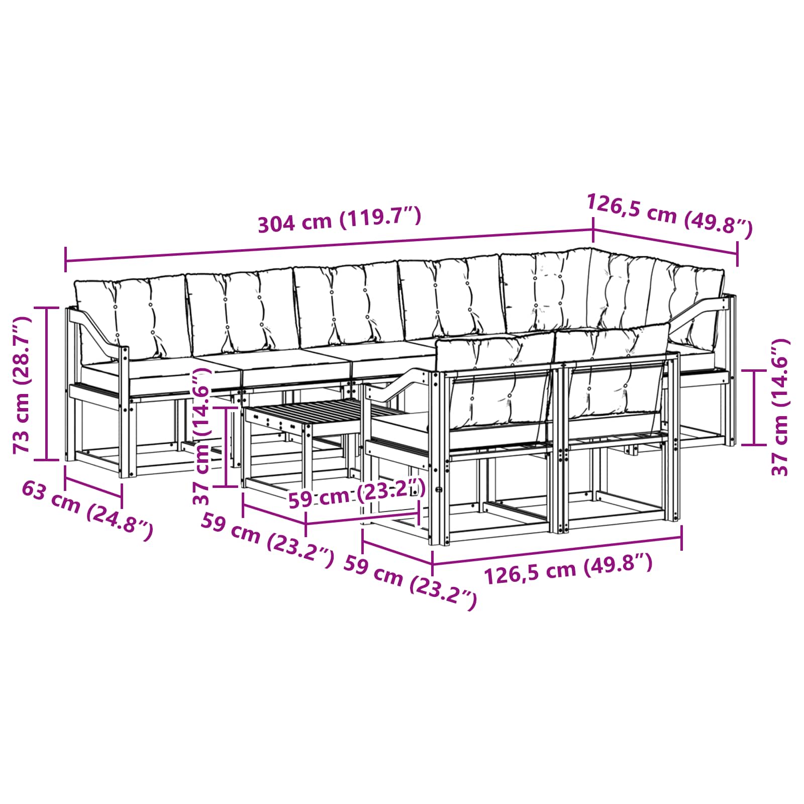 - 7 x Divano centrale: 59 x 63 x 73 cm (LxWxH)