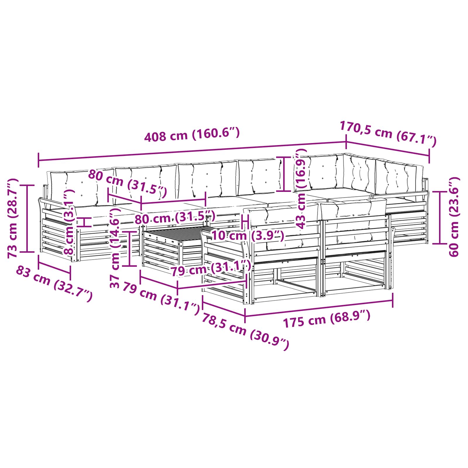 - 9 x Cuscino per Schienale: 80 x 43 x 10 cm (LxWxH)