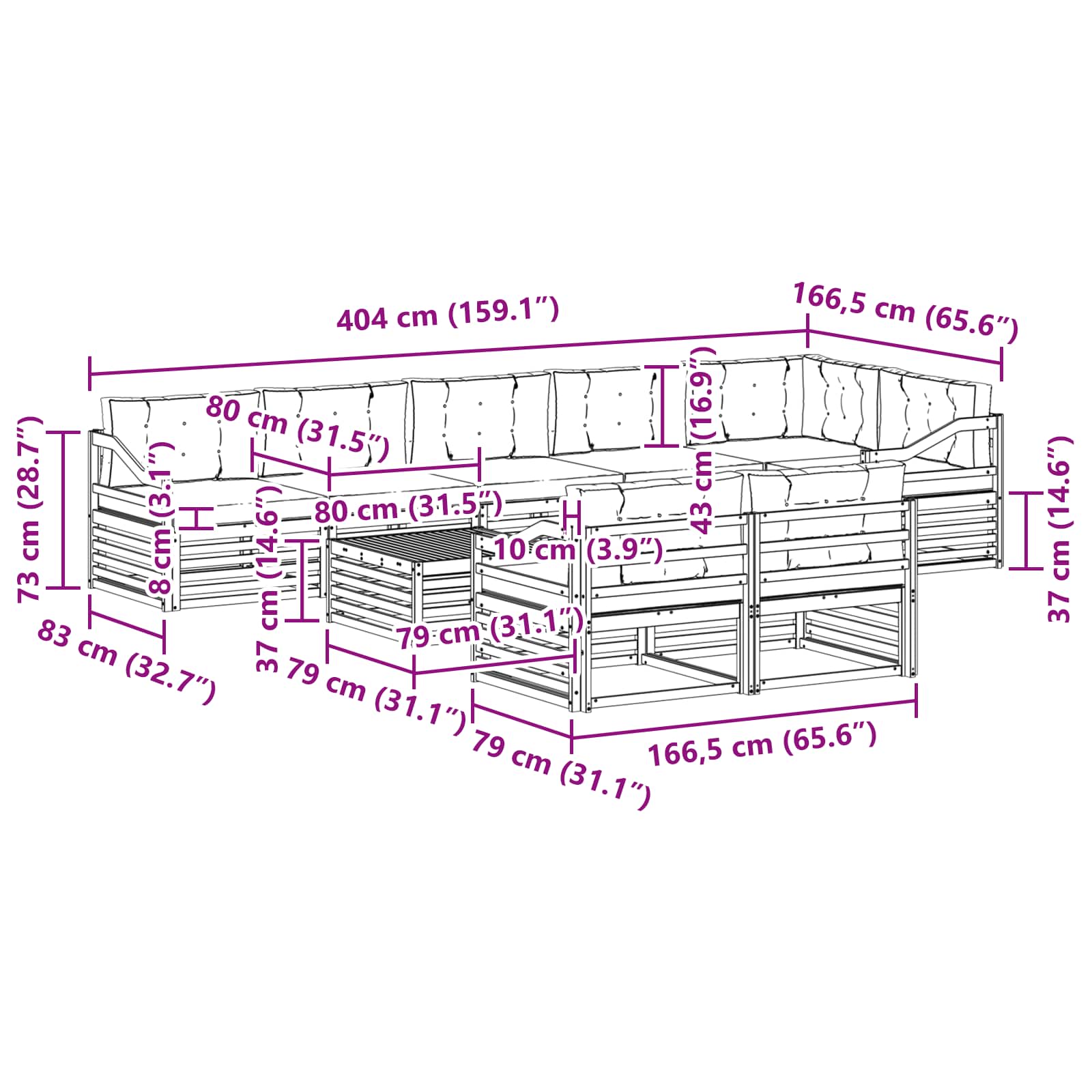 - 9 x Cuscino per Schienale: 80 x 43 x 10 cm (LxWxH)