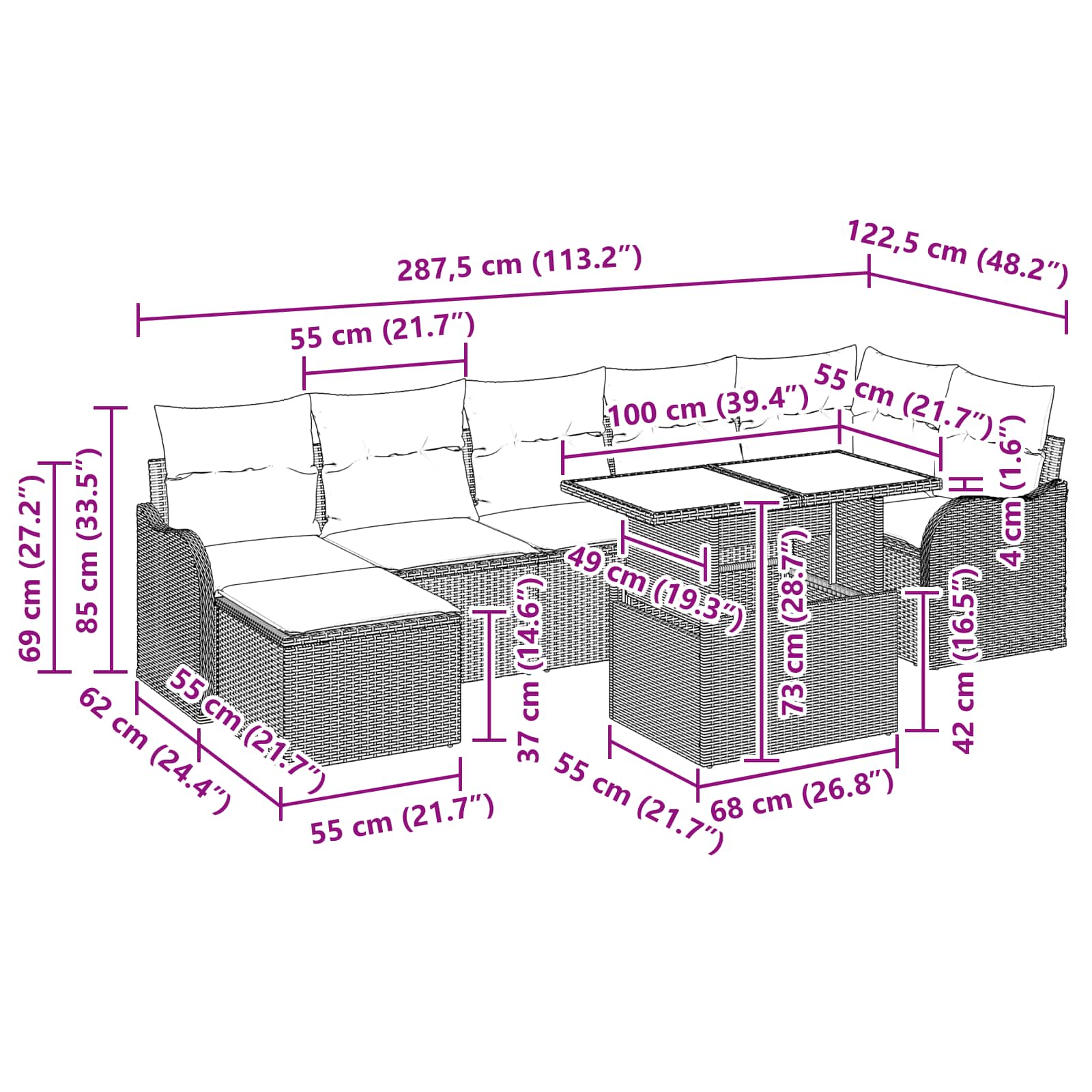 - Usi versatili: Ottimo per molte configurazioni outdoor, il set modulare si adatta facilmente, che tu stia organizzando una festa o semplicemente leggendo un libro. Le sezioni possono essere riorganizzate per diverse opportunità e spazi come giardini e terrazze.