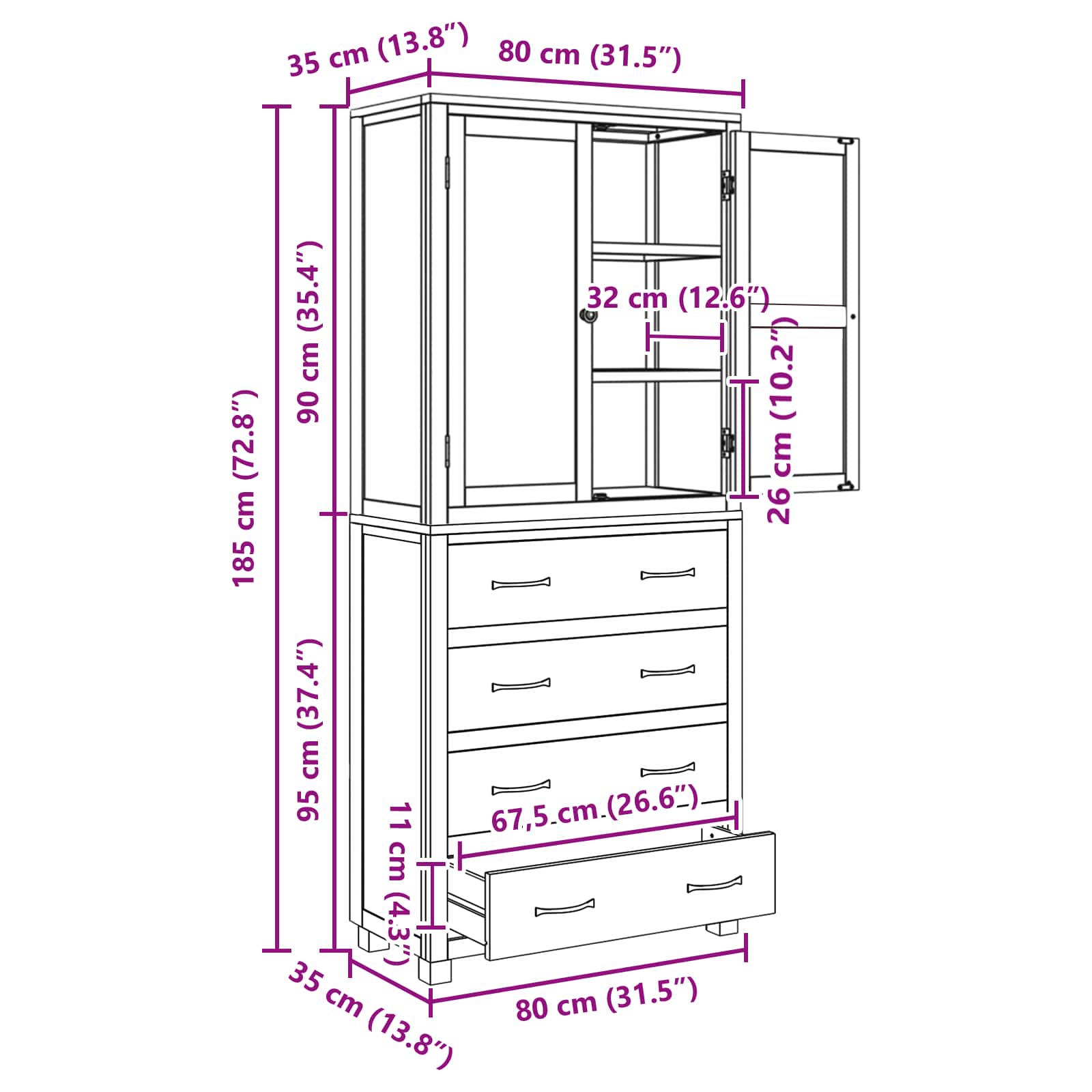 - Dimensioni complessive: 80 x 35 x 185 cm (L x P x A)