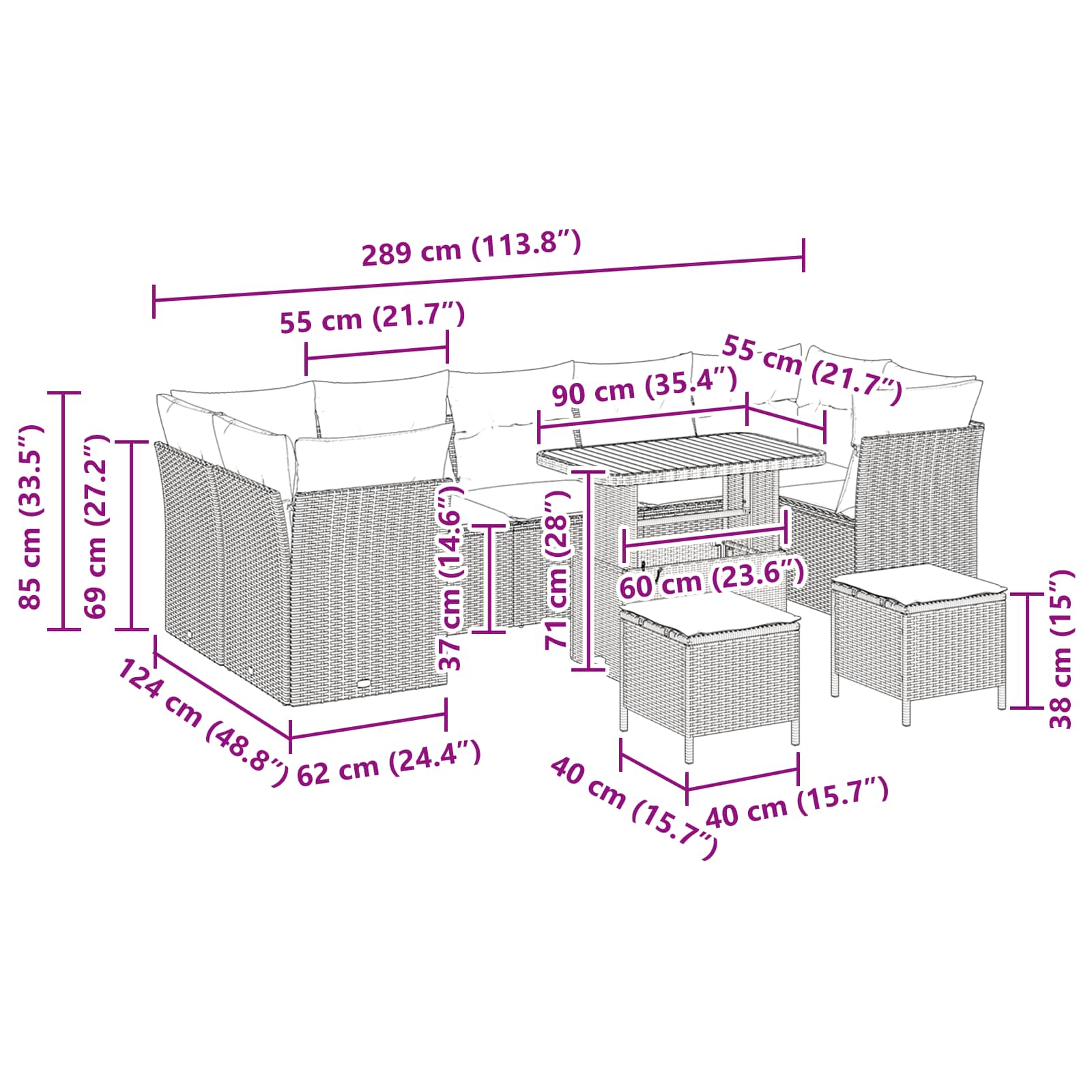 - 4 x Seduta Angolare: 62 x 62 x 69 cm (LxWxH)