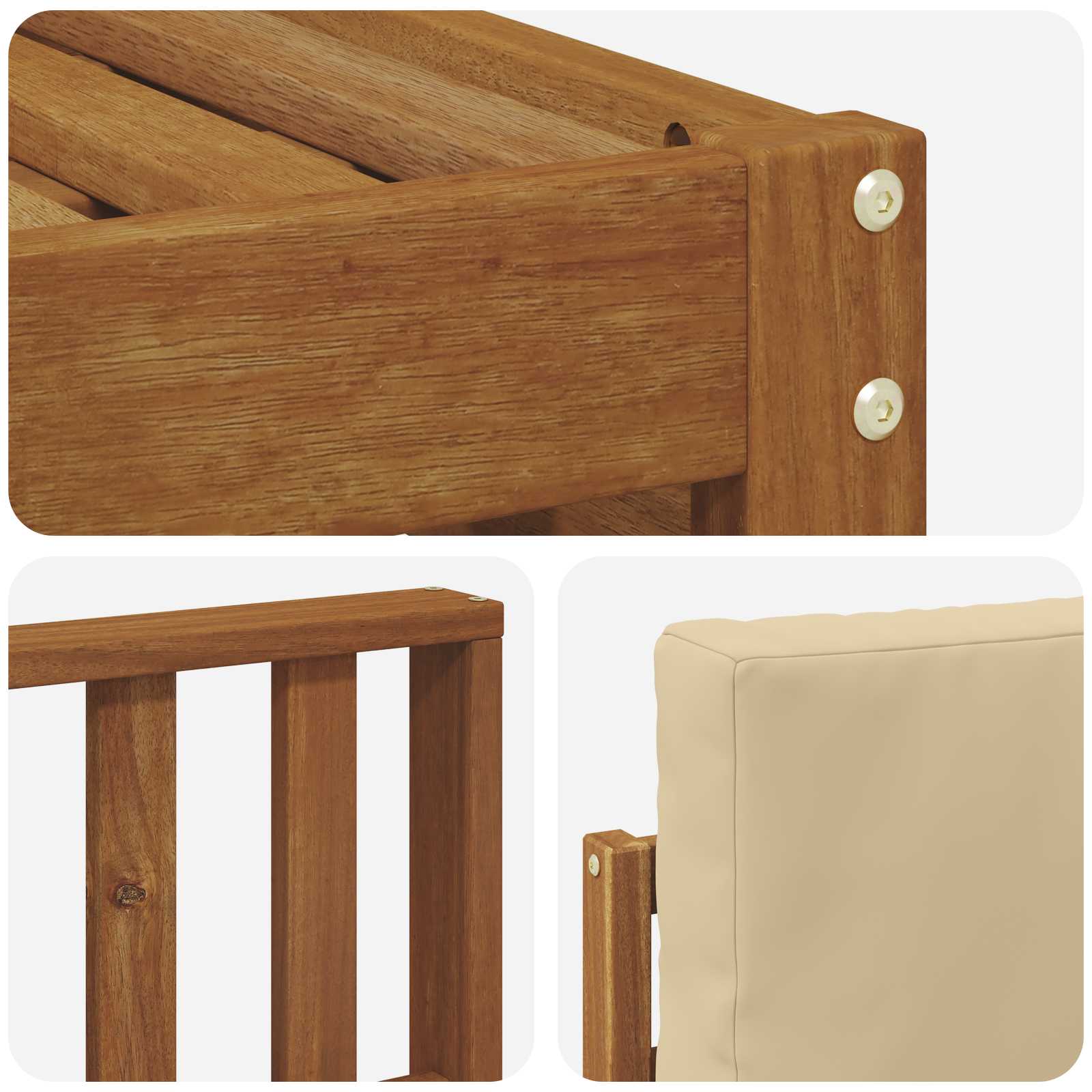 - Legno massello di acacia di alta qualità: Questo set è fatto di legno massello di acacia, noto per la sua resistenza e il suo aspetto naturale. È ideale per gli spazi esterni, resistendo agli agenti atmosferici senza perdere il suo fascino.