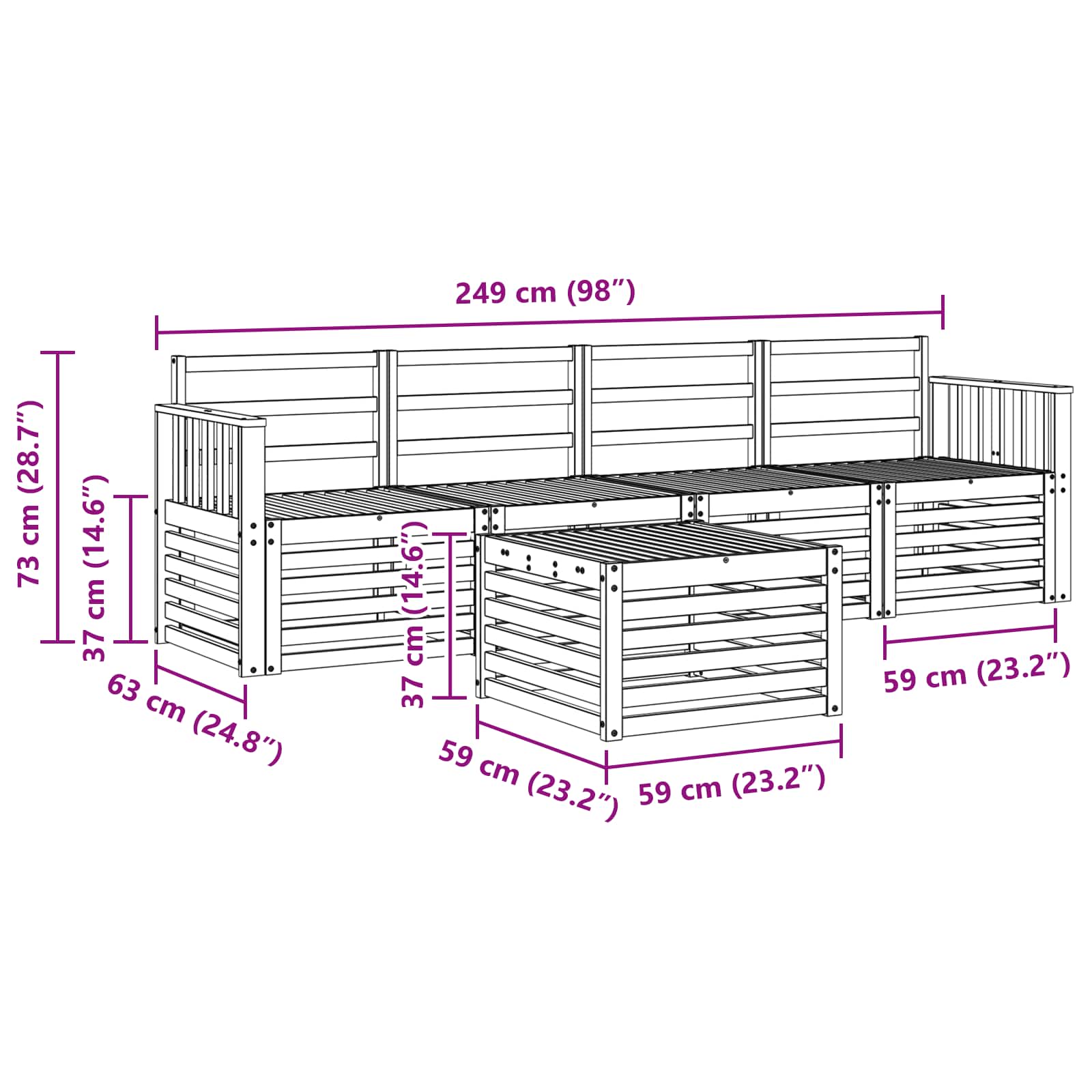 - 4 x Divano centrale: 63 x 59 x 73 cm (LxPxA)