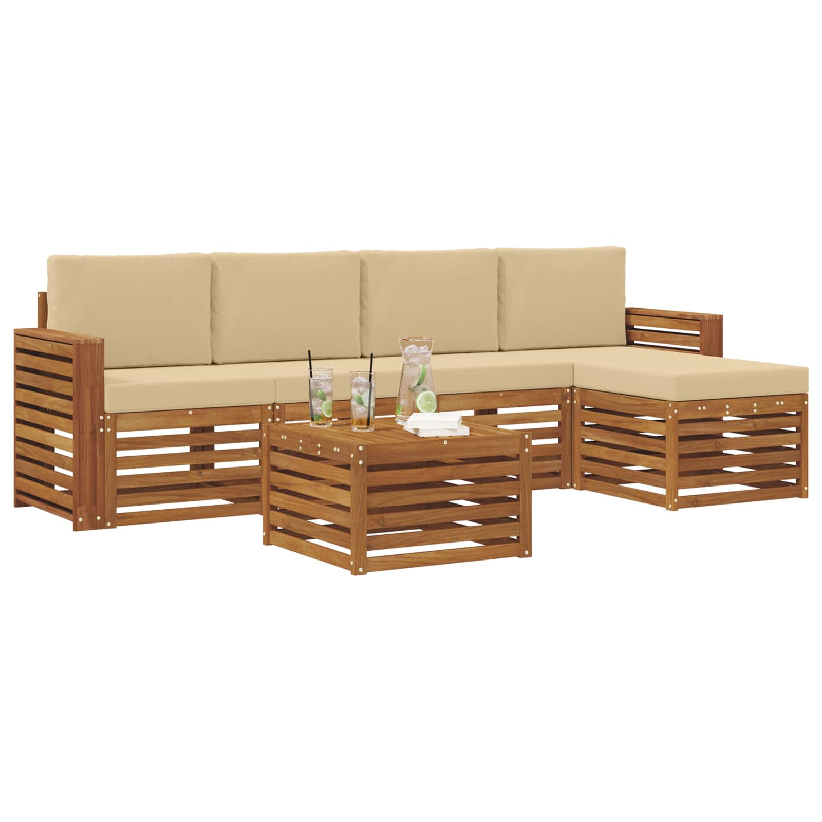 Questo set di mobili per esterni unisce stile e praticità, diventando il punto focale del tuo giardino o terrazza. Il design moderno, con linee pulite e dettagli minimalisti, porta eleganza e crea un'atmosfera perfetta per rilassarsi e socializzare all'aperto. È realizzato in legno massello di acacia, quindi è durevole e mantiene un aspetto fantastico nel tempo, ideale per chi cerca sia funzionalità sia design ricercato.
