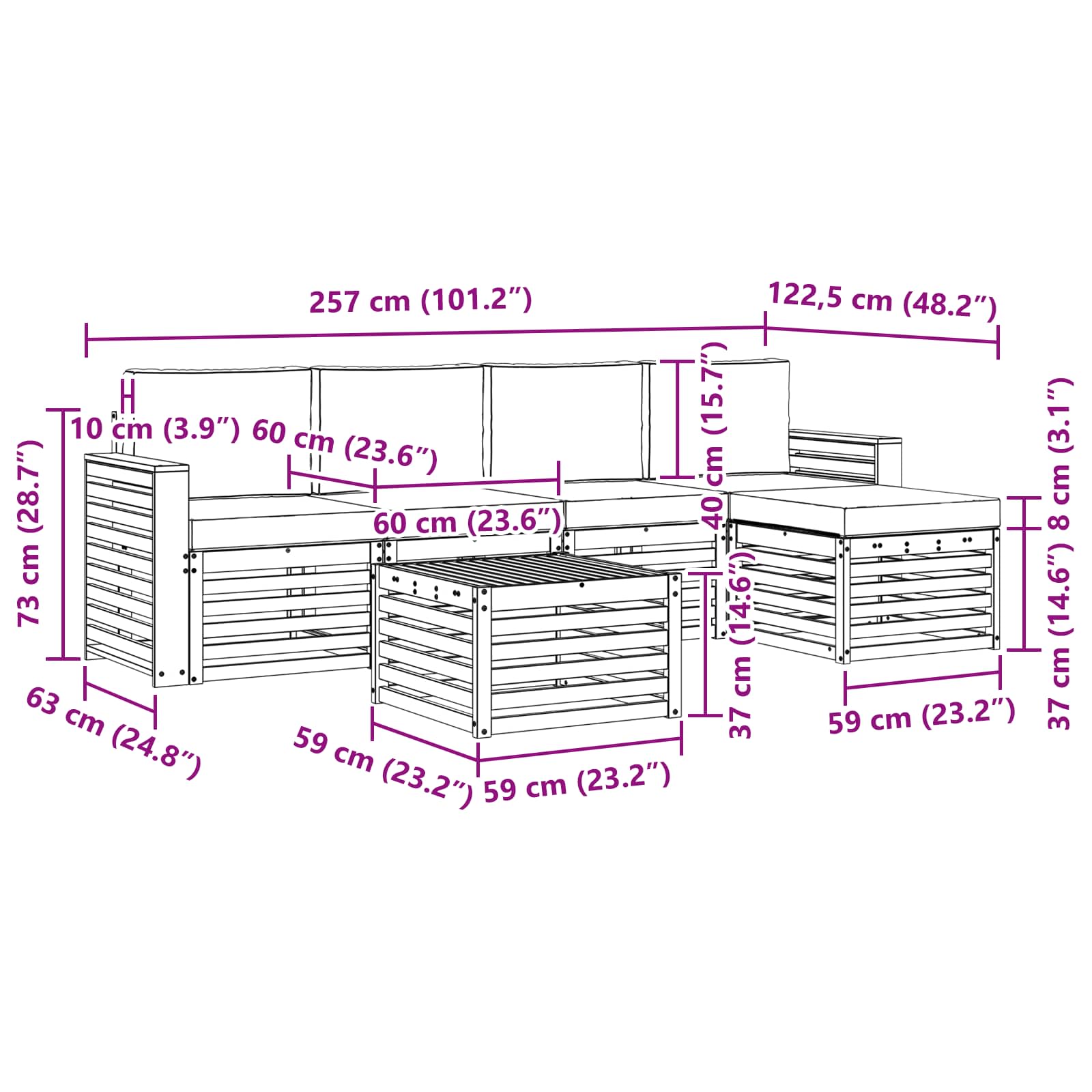 - 5 x Cuscino per seduta: 60 x 60 x 8 cm (L x P x A)