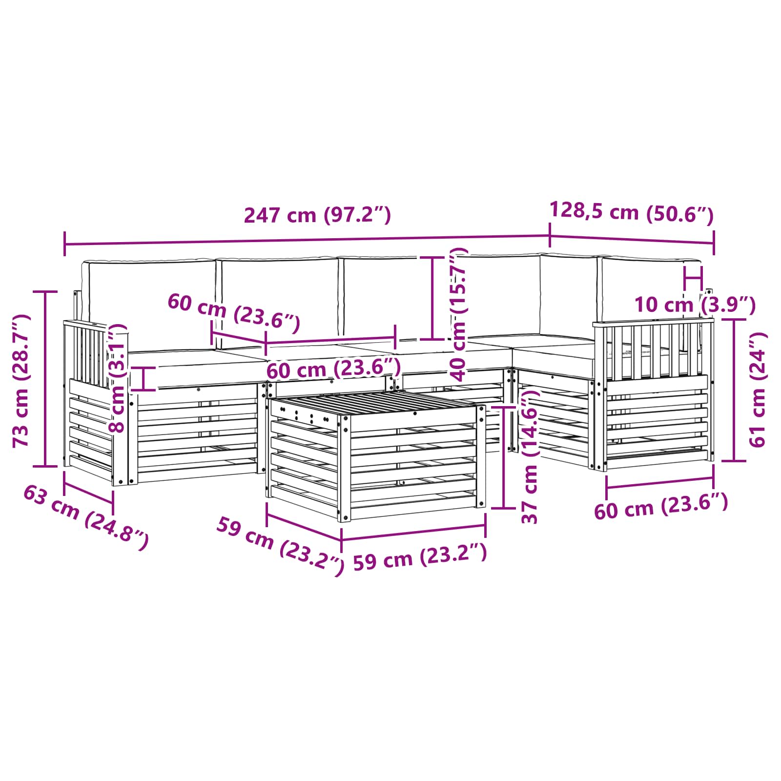 - 5 x Cuscino per seduta: 60 x 60 x 8 cm (L x P x A)