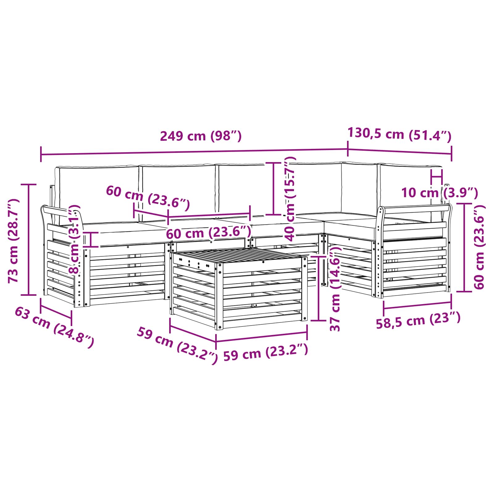 - 5 x Cuscino seduta: 60 x 60 x 8 cm (L x P x A)