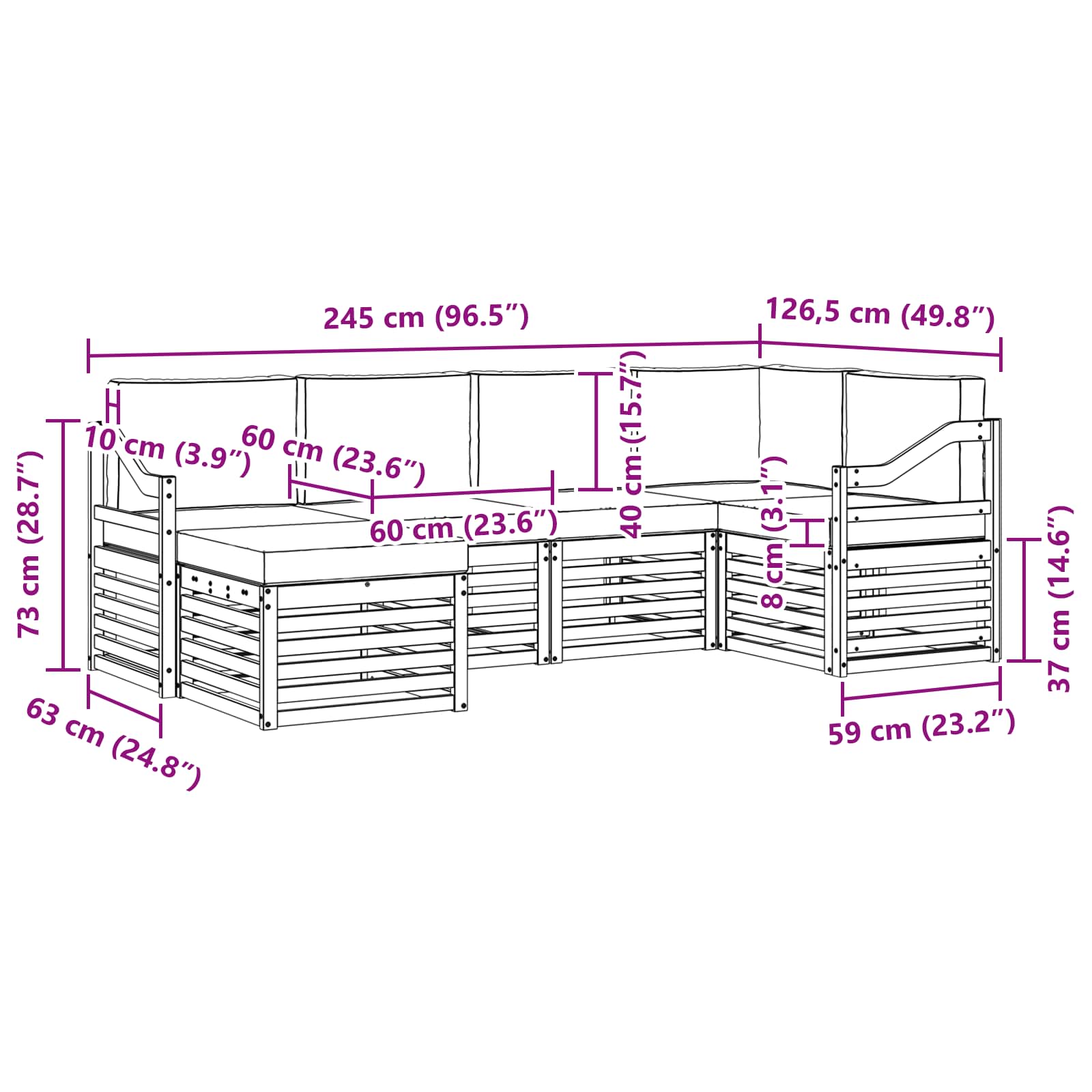 - 6 x Cuscino schienale: 60 x 40 x 10 cm (L x P x A)