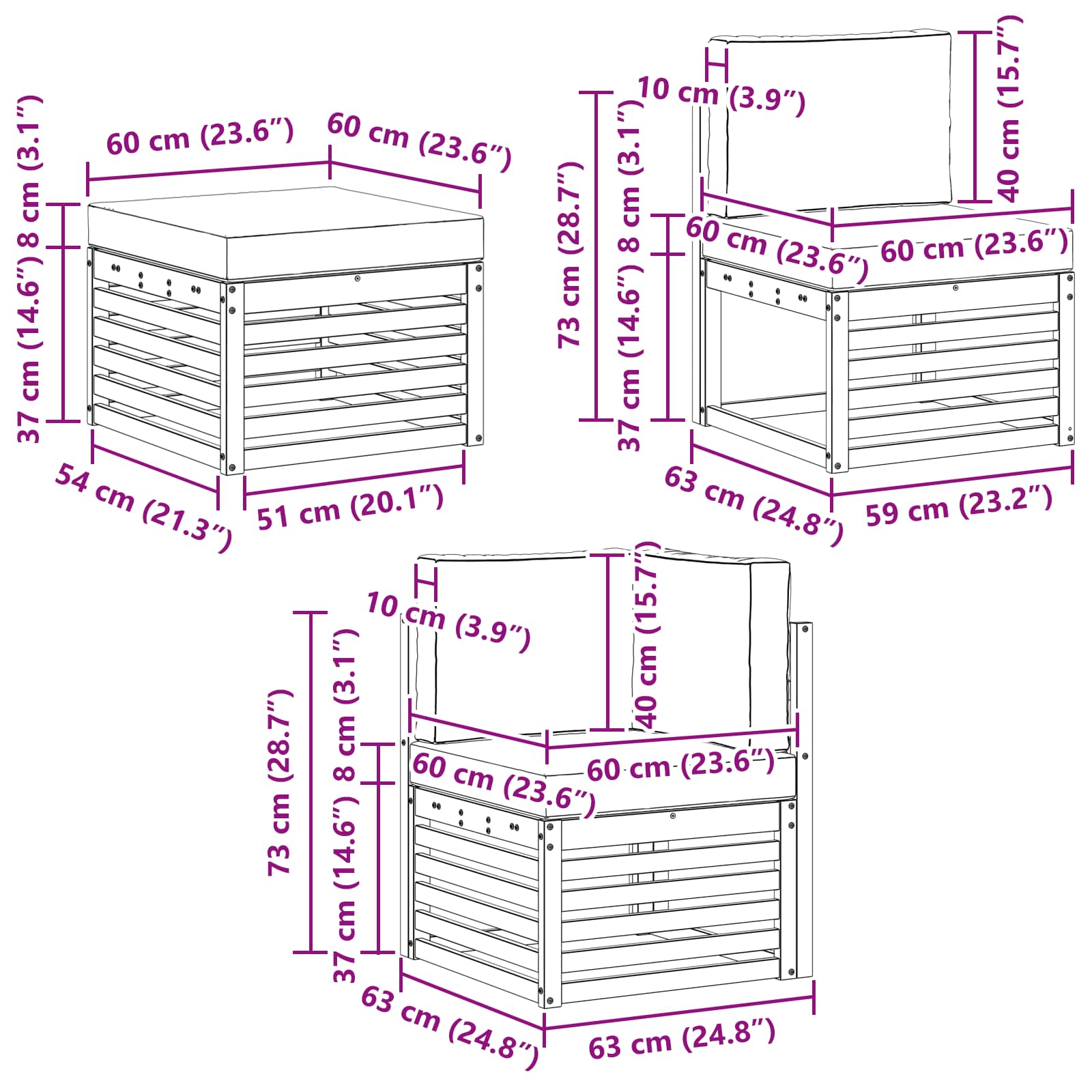 - 6 x Cuscino seduta: 60 x 60 x 8 cm (L x P x A)