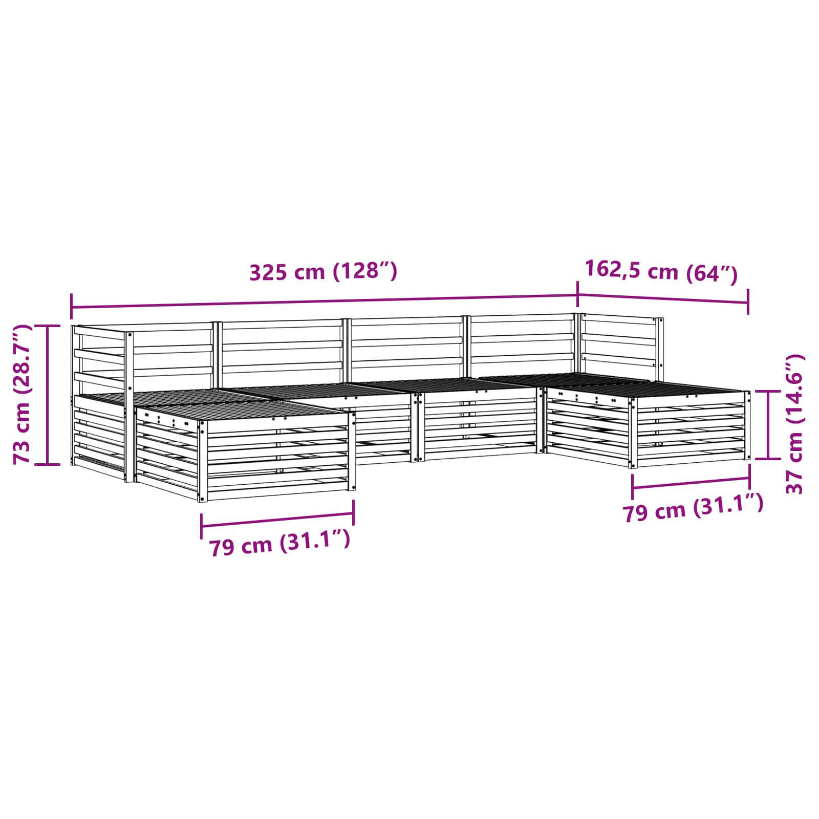 - 2 x Puff: 79 x 79 x 37 cm (LxPxH)