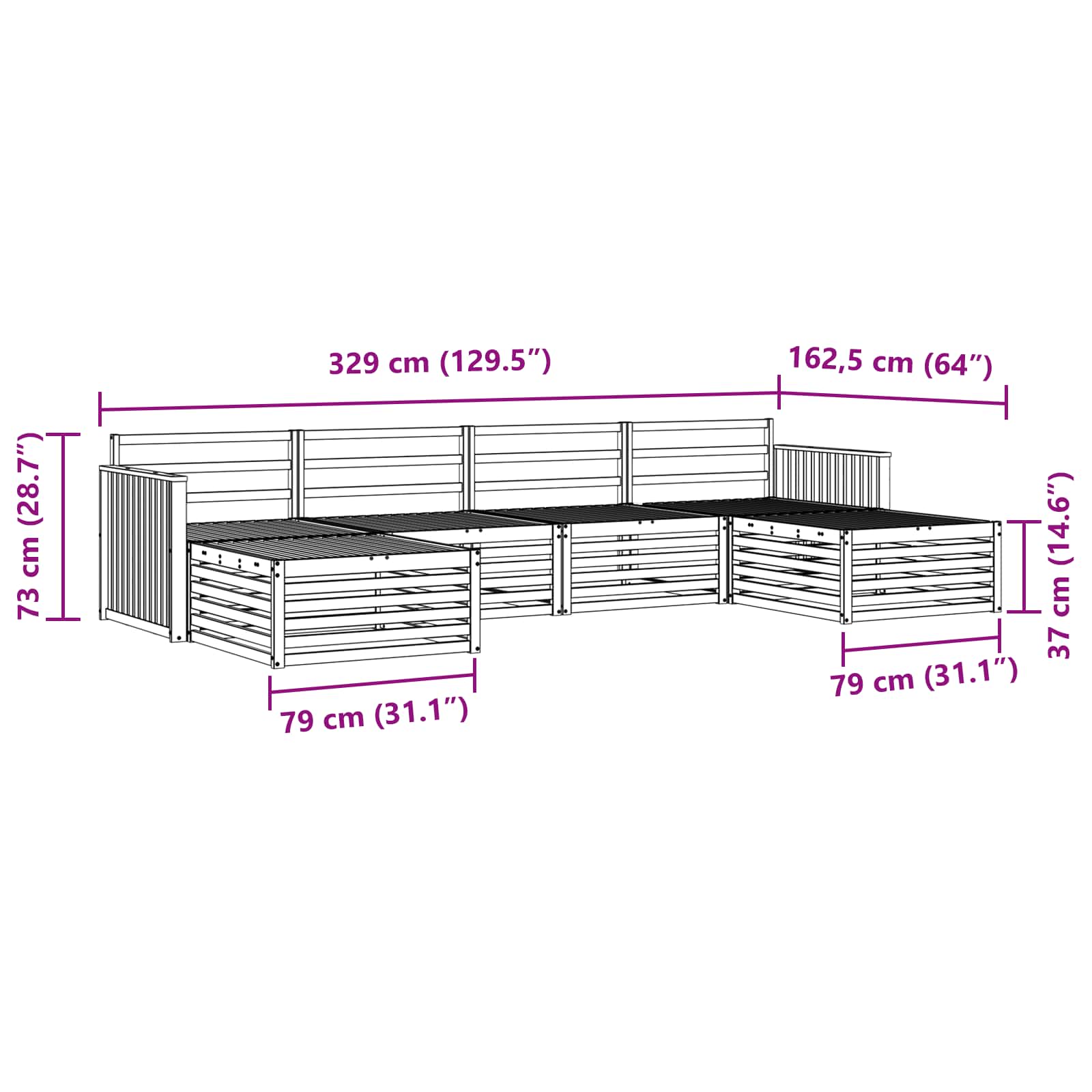 - 2 x Puff: 79 x 79 x 37 cm (LxPxH)