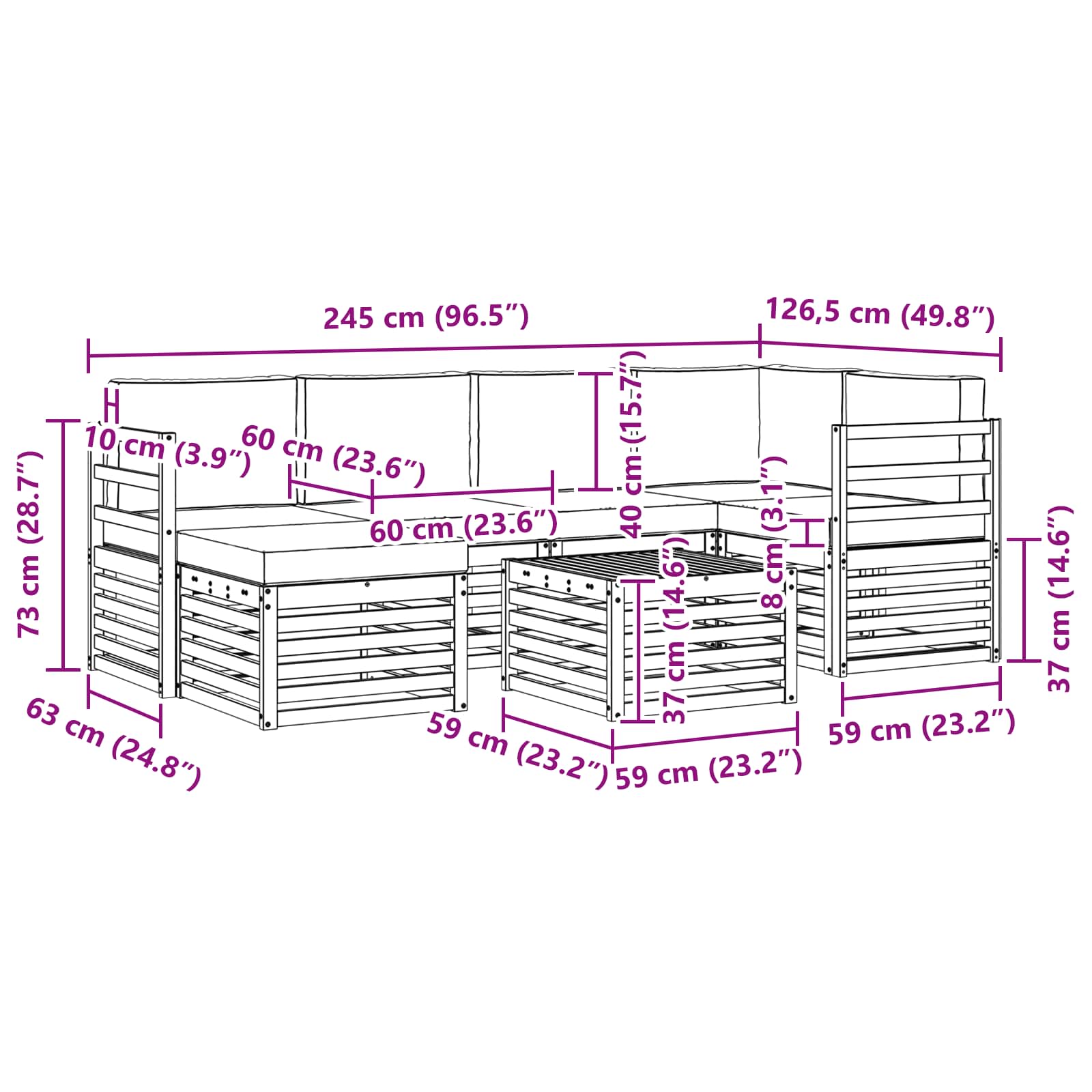 - 6 x Cuscino schienale: 60 x 40 x 10 cm (L x P x A)