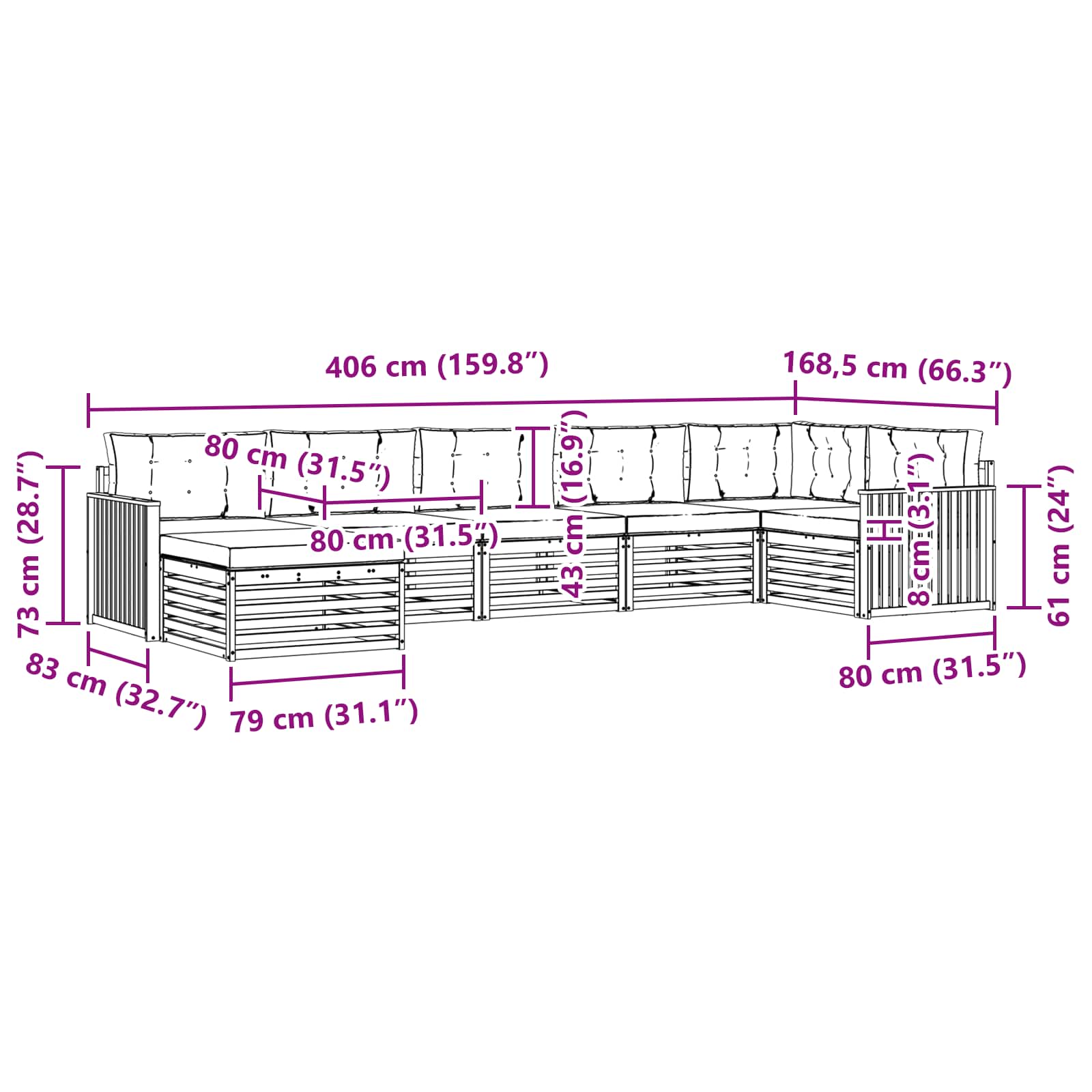 - 7 x Cuscino seduta: 80 x 80 x 8 cm (L x P x A)