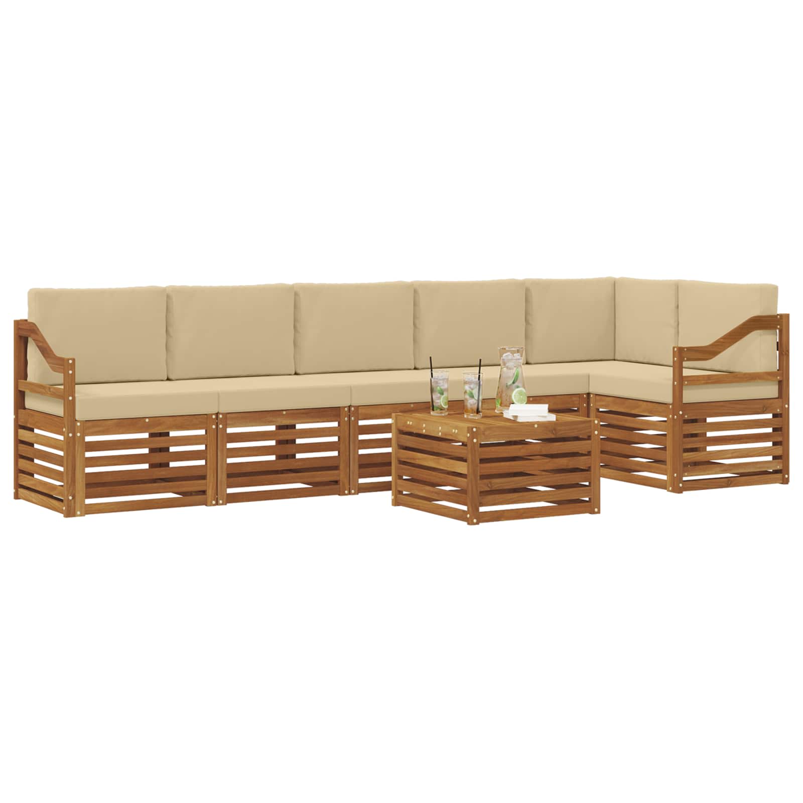 Questo set di divani sezionali per esterni, realizzato in legno massello di acacia, unisce stile e resistenza, perfetto per giardini, patii e aree piscina. Dal design moderno ed elegante, offre una disposizione modulare adatta a qualsiasi spazio. Crea un'atmosfera accogliente con i suoi toni marroni che si integrano benissimo nell'ambiente naturale, ideali sia per momenti rilassanti che per feste con amici.