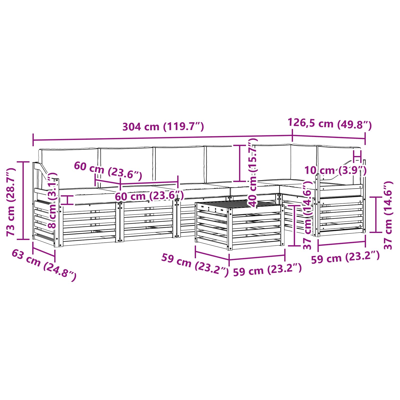 - 6 x Cuscino della seduta: 60 x 60 x 8 cm (L x P x A)