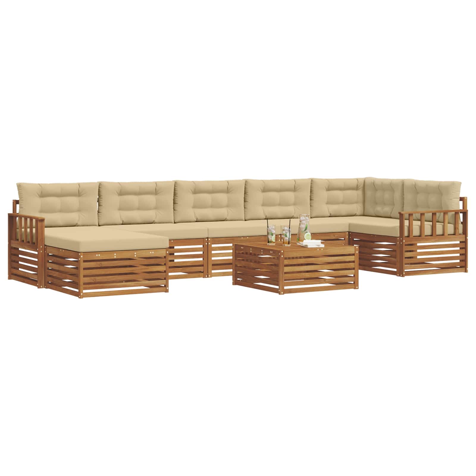 Questo Set di Divani Sezionali da Esterno è un mobili versatile e trendy pensato per trasformare il tuo giardino, patio o giardino posteriore in un rifugio elegante e accogliente. Con un'estetica moderna, questo set combina linee pulite e design funzionali, integrandosi facilmente in qualsiasi spazio esterno e diventando il punto ideale per rilassarsi o intrattenere gli amici. Grazie alla sua combinazione di legno naturale e struttura robusta, il set diventa un elemento decorativo e una soluzione pratica per sedersi.