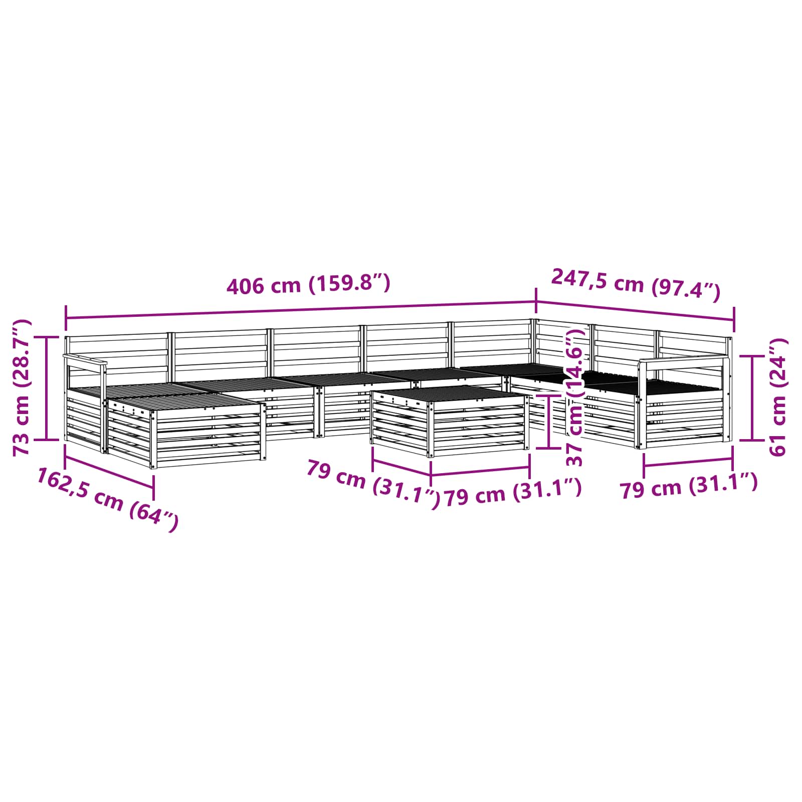 - 1 x Hocker: 79 x 79 x 37 cm (L x P x A)