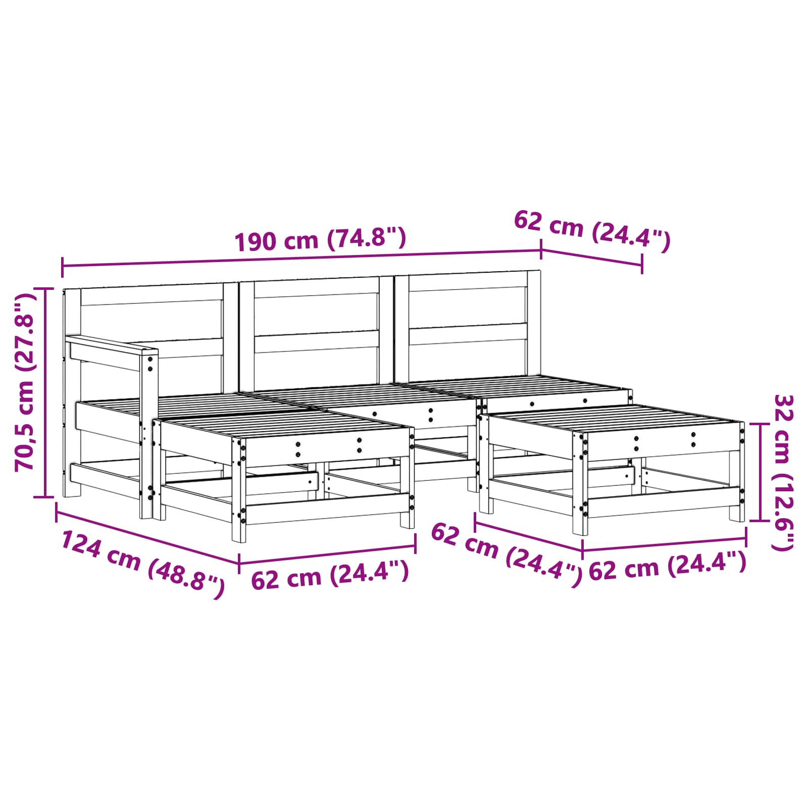 - Materiale: Set da lounge in legno di pino massello, noto per la sua forza e durata, che offre una base robusta per il divertimento all'aperto. La superficie liscia ha un aspetto moderno, perfetto per il tuo giardino.