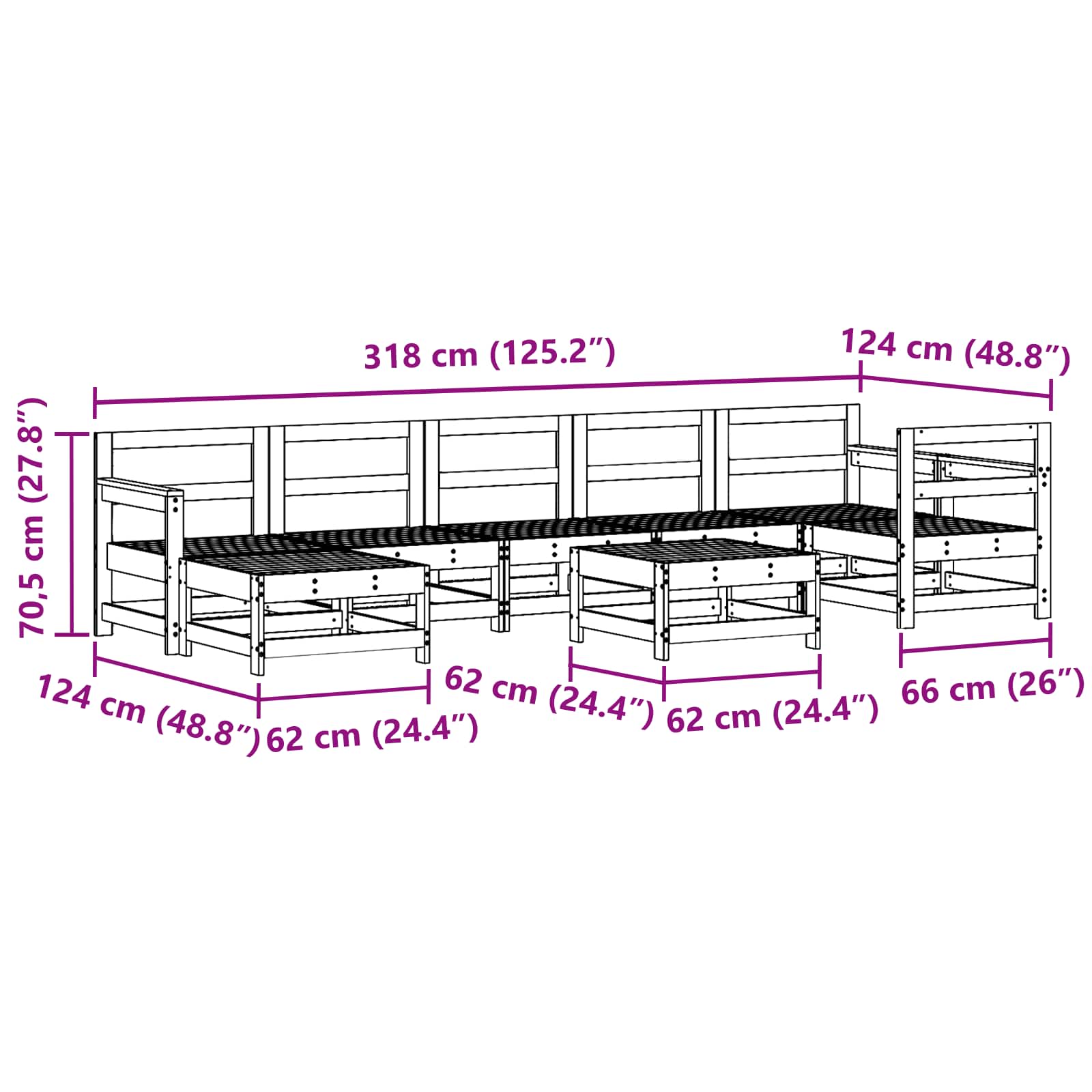 - Dimensioni complessive: 318 x 124 x 70,5 cm (L x P x A)