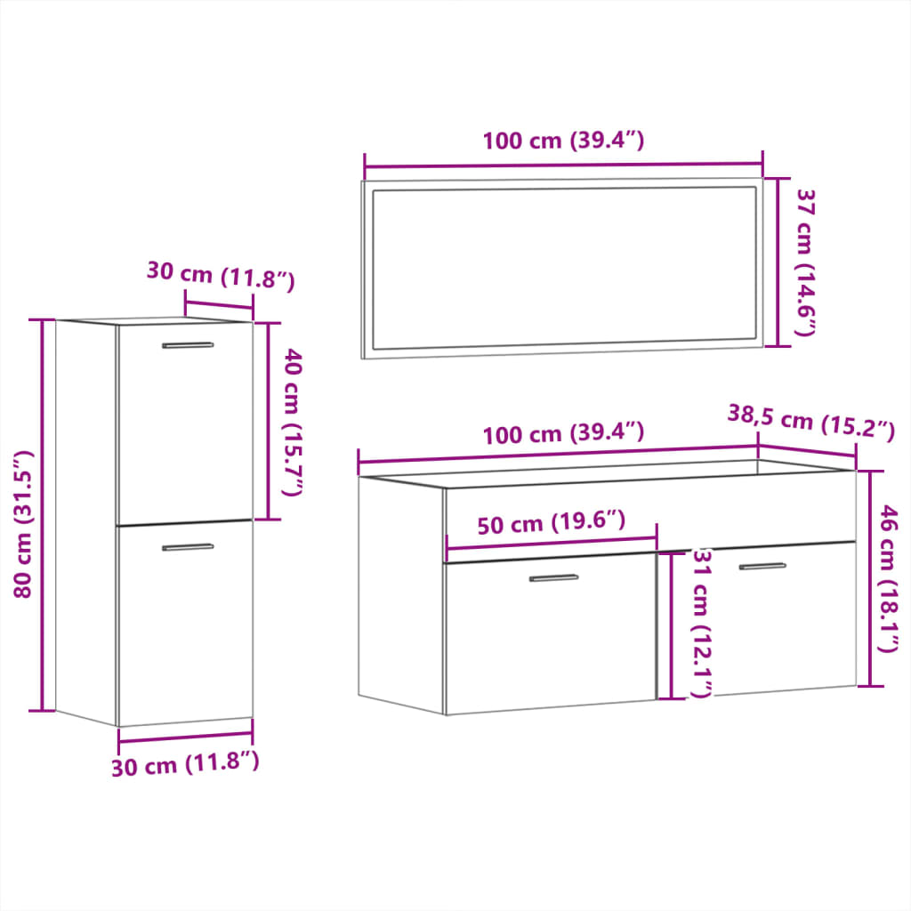 - Dimensioni del mobile lavabo: 100 x 38,5 x 46 cm (L x L x A)