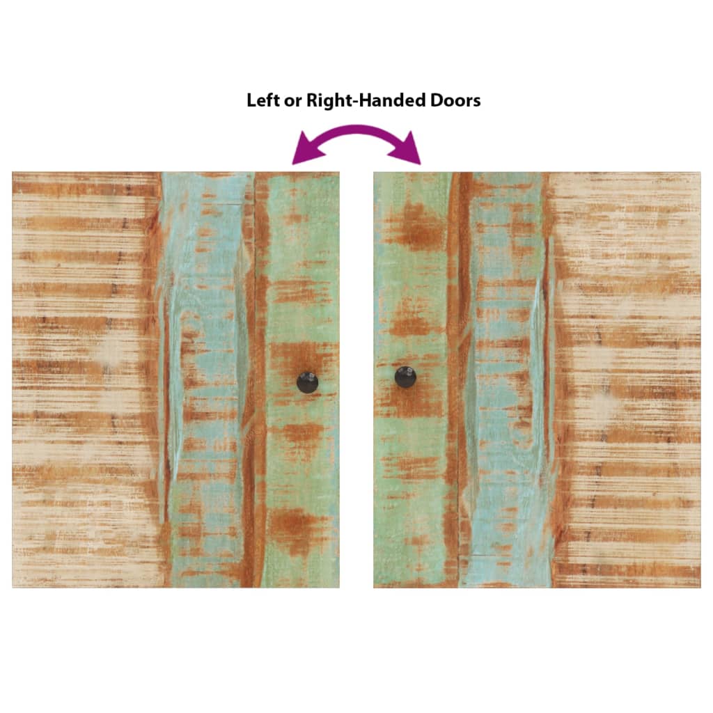 - Legno massello di recupero: Questo mobile è realizzato in legno massello di recupero combinato con il legno multistrato. Il legno massello di recupero è costituito da legni riutilizzati quali il teak, il legno di mango, il legno di pino, e il faggio. Questi materiali sono riciclati da vecchi immobili come fabbriche, capannoni e barche.