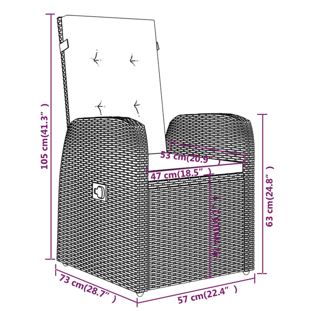 - Dimensioni sedia (non reclinata): 57 x 73 x 105 cm (L x P x A)