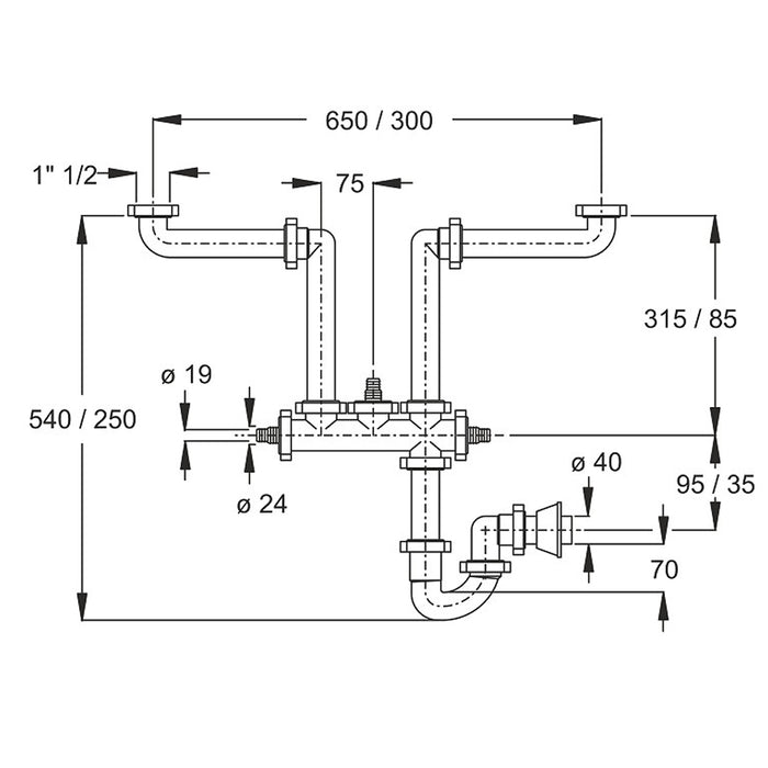 Sifone space 2 vie lavello salva spazio 3 attacchi ausiliari 1.1/2x40 bonomini
