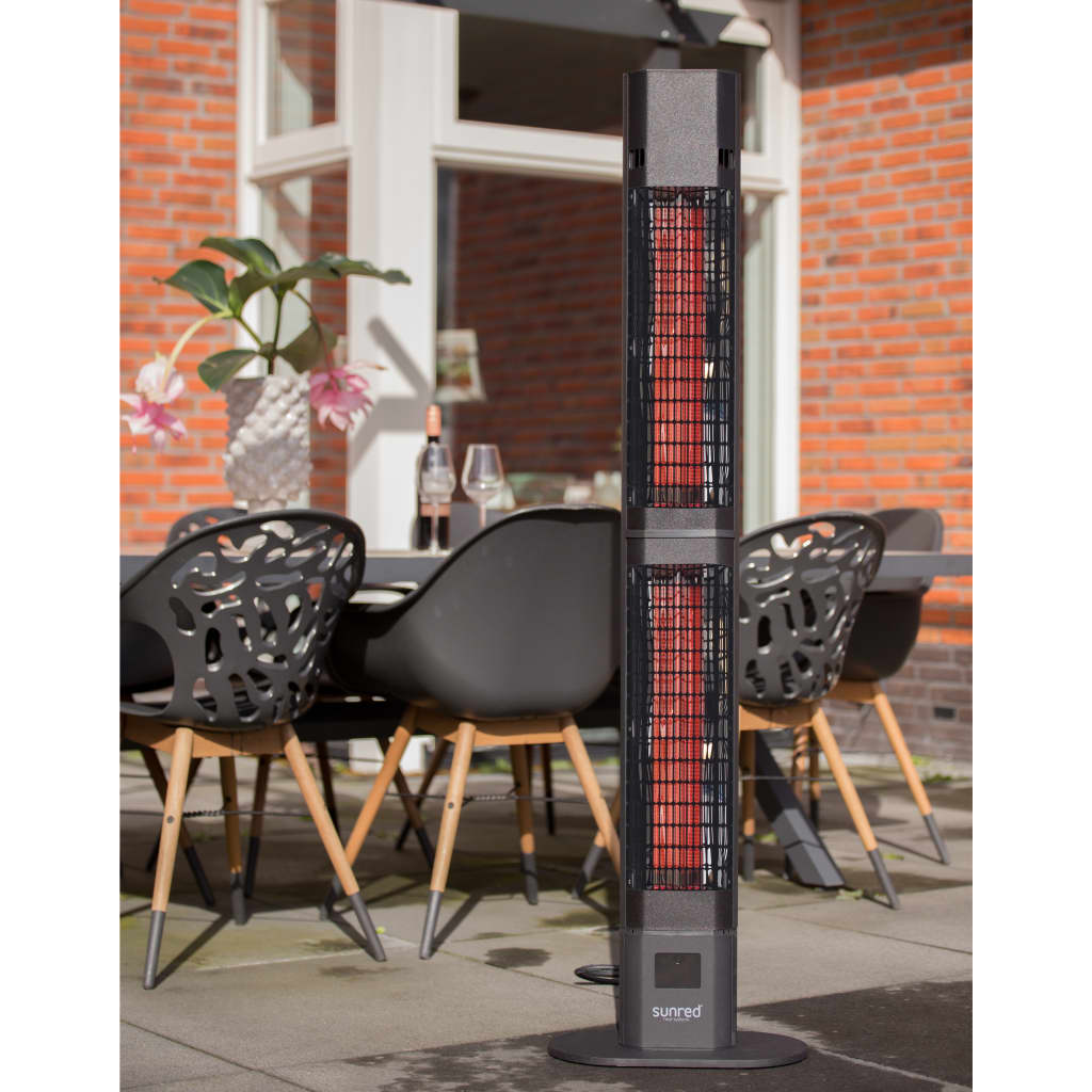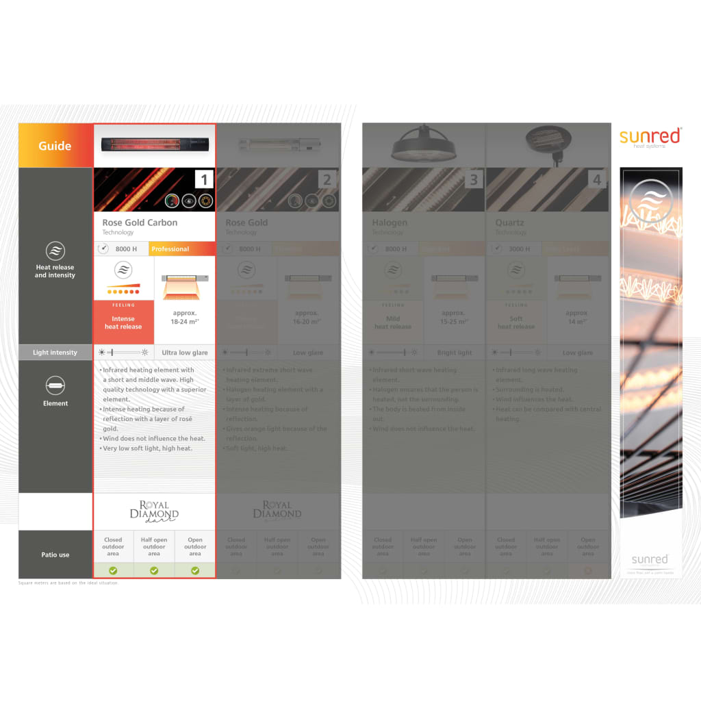 Questo riscaldatore ha una potenza massima in ingresso di 3000 W e un bellissimo design sottile con finitura nera. L'elemento riscaldante Royal Diamond Dark può essere impostato in basso (1500 W) o alto (1500 W) o con entrambe le lampade accese (3000 W). Il riscaldatore per esterni della Sunred è dotato di un elemento riscaldante a infrarossi in fibra di carbonio con rivestimento in oro rosa sul tubo di riscaldamento. In questo modo, potete sperimentare un calore intenso con un bagliore minimo.