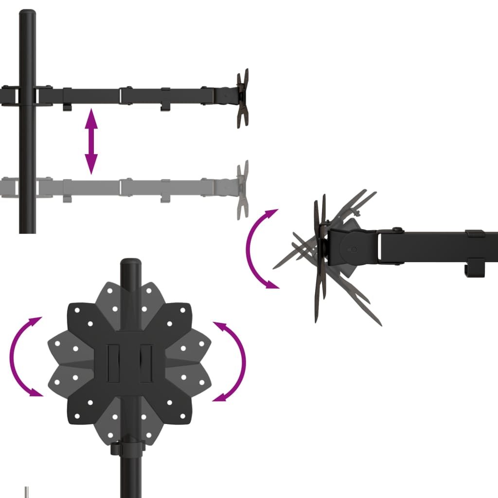 - Regolabile in molti modi: Questo supporto per monitor può inclinarsi verso l'alto o verso il basso di 90°, ruotare a destra o a sinistra di 90° o 120°, e girare di 360°. Potete anche regolarne l'altezza per ottenere una visione ottimale.