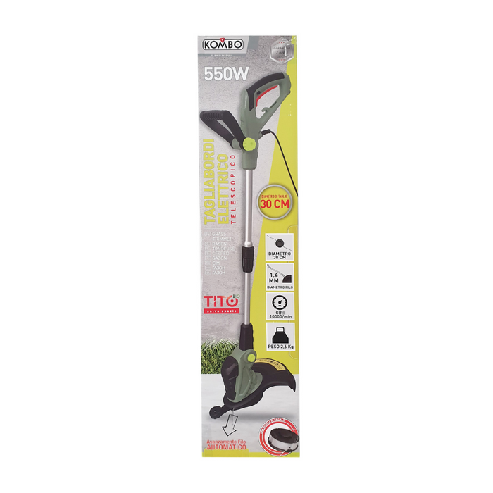 Tagliabordi Elettrico 550W 230V/50Hz, manico telescopico in alluminio con impugnatura regolabile. diametro di taglio 30cm, Testina ad avanzamento automatico con1 rocchetto di filo diam.1,4mm x 6Mt a doppia linea. Manico Telescopico in alluminio estendibile +18cm. Manico ausiliario regolabile. Testa orientabile 30° per tagli in zone altrimenti inaccessibili. Certificato CE EMC GS PAHS ROHS