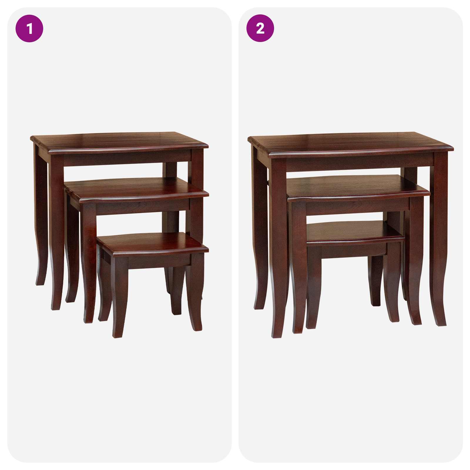 - Finitura in mogano massello: Questo set di tavolini è realizzato in legno massello di mogano premium, noto per la sua resistenza e i suoi bei motivi. La lavorazione attenta assicura che siano una scelta duratura e bella per l'uso quotidiano.
