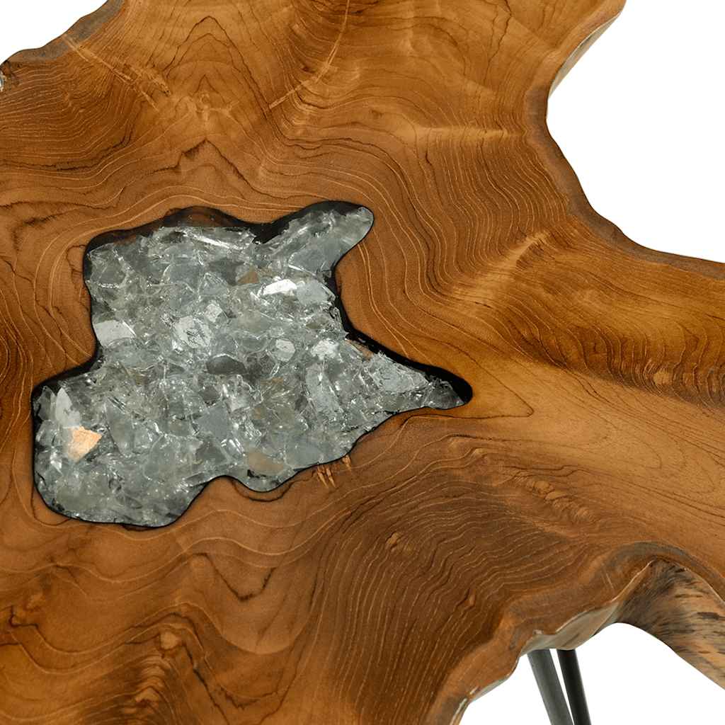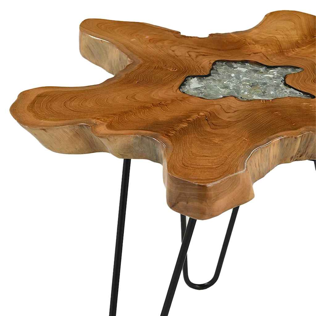 Questo esclusivo tavolino da salotto, realizzato in legno massello di teak con una decorazione in poliresina trasparente, emana un fascino rustico ed è una vera attrazione. Il suo caratteristico piano offre una superficie stabile e sicura su cui potrete posizionare bevande, vasi, cesti di frutta o soprammobili. Il piano del tavolino è realizzato con la vera radice dell'albero di teak, e sarà un tocco di classe.