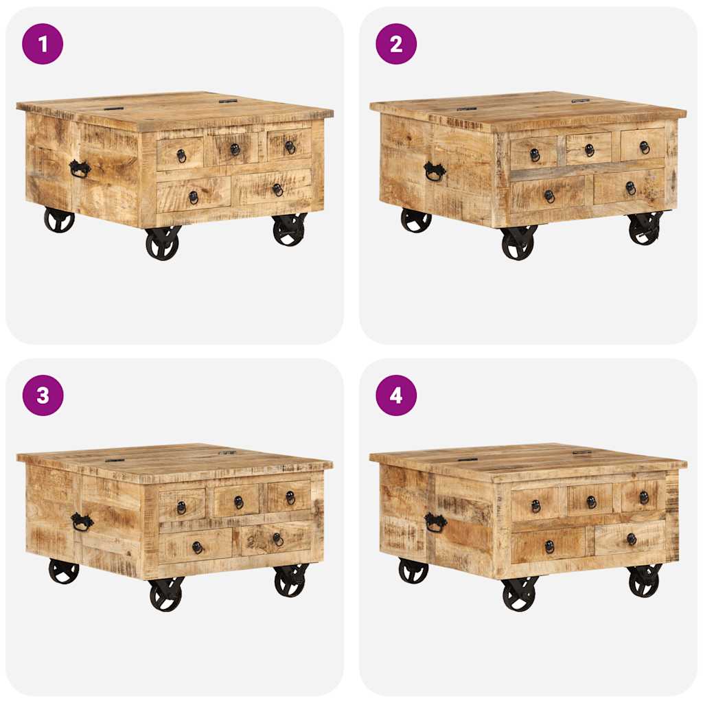 Il tavolino da salotto è realizzato a mano in legno massello di mango grezzo che è stabile, durevole e bello, e l'artigianato si aggiunge al suo spettacolare stile retrò. Ogni fase del processo viene effettuata con la massima cura, che si tratti di lucidatura o laccatura. La lavorazione artigianale e le bellissime venature del legno rendono ogni pezzo unico e leggermente diverso dall'altro. Inoltre, i 5 cassetti e l'ampio vano interno offrono ampio spazio per tutti gli oggetti che desiderate tenere a portata di mano. Il tavolo è dotato di 4 ruote in ferro che ne facilitano lo spostamento e completano il design industriale.