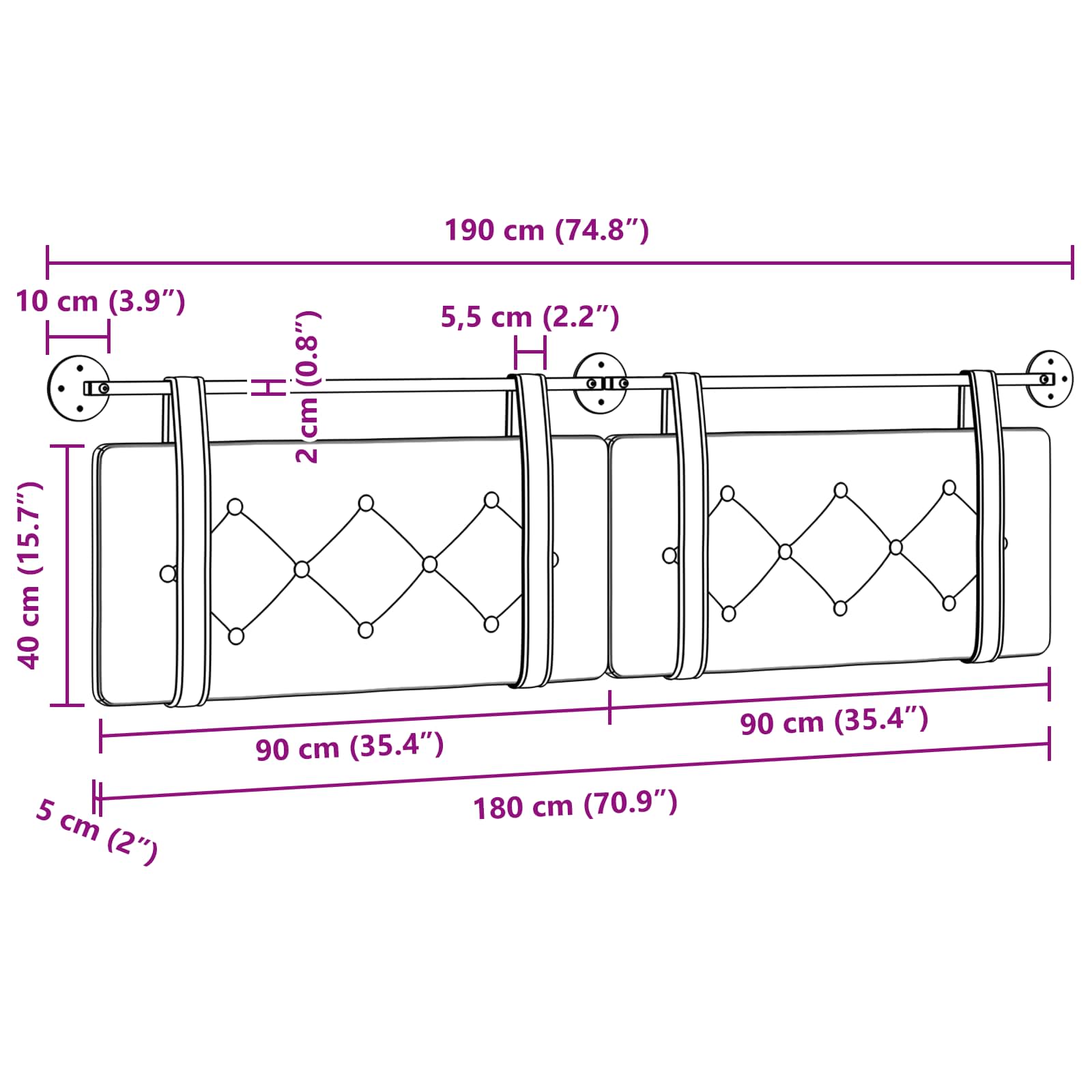 - Dimensione pannello testiera: 90 x 40 x 5 cm (L x p x a)