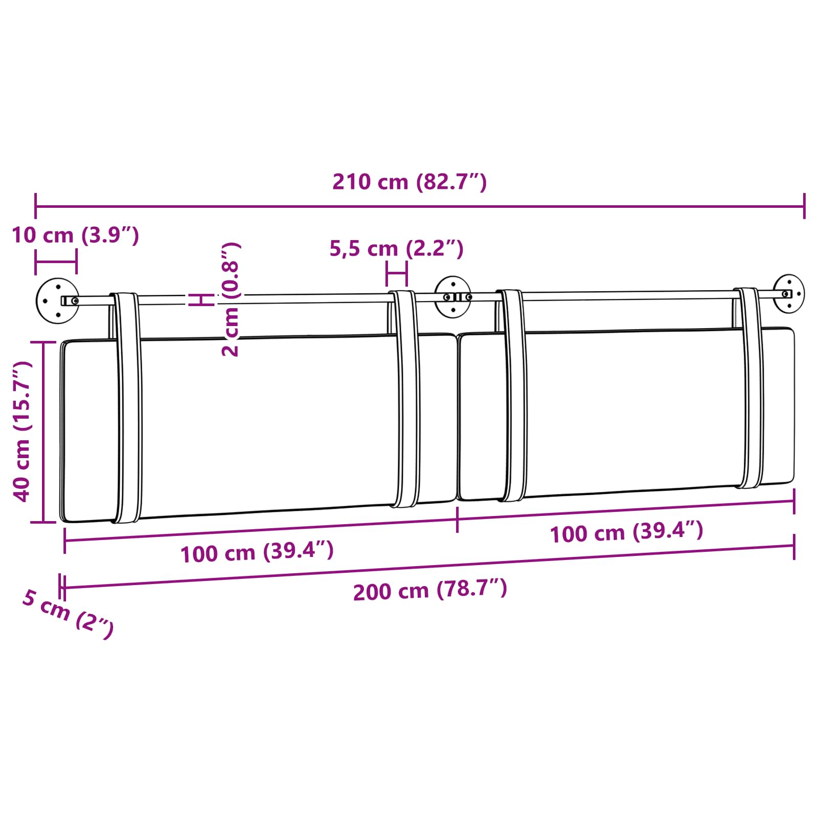 - Dimensioni complessive: 210 x 55 x 5 cm (L x P x A)