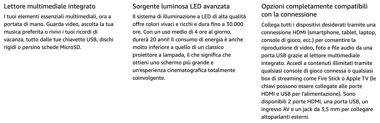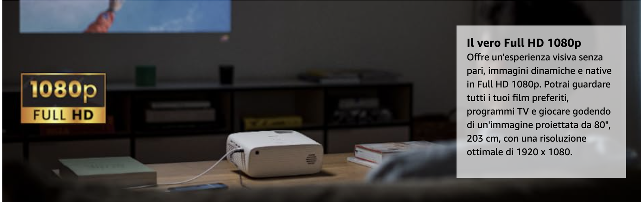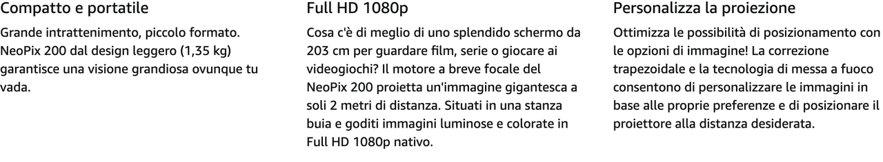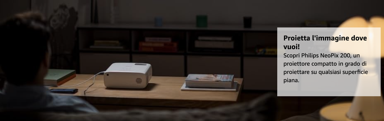 NeoPix 200 è in grado di riprodurre immagini luminose e colorate da 80" di larghezza in Full HD 1080p nativo in una stanza buia. Le sue doppie porte HDMI consentono di collegare la console di gioco o qualsiasi altro dispositivo come un laptop. uno smartphone o un lettore Blu-ray. Basta collegare la chiavetta USB o il disco rigido per riprodurre film. immagini e persino musica con il lettore multimediale integrato. L'altoparlante da 5 Watt garantisce un suono potente ovunque ci si trovi e. grazie al jack audio da 3.5 mm. è possibile collegare altoparlanti esterni per un suono più potente. NeoPix 200 include anche un cavo da USB-C a HDMI. per collegare lo smartphone e guardare le proprie app di streaming video preferite sul proiettore.